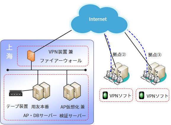用友を他拠点から利用する上で、上海拠点と各利用拠点間を安全に通信させる必要があります。