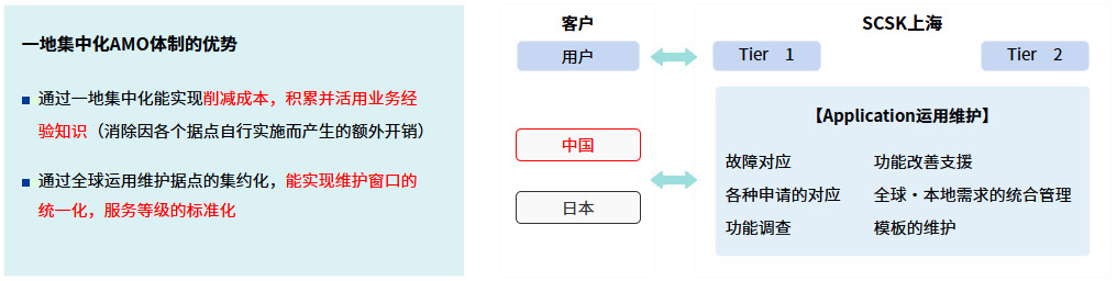 为此,运用维护的全球统括・效率化的对策成为课题需要解决。 - 对于用户企业需要通过全球运用维护据点的集约化来实现维护窗口的统一化,服务等级的标准化以及运用维护成本的最优化。