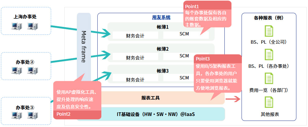 通过为A社(中国现地各办事处用户数100名以上)导入用友系统实现对应中国新会计基准、