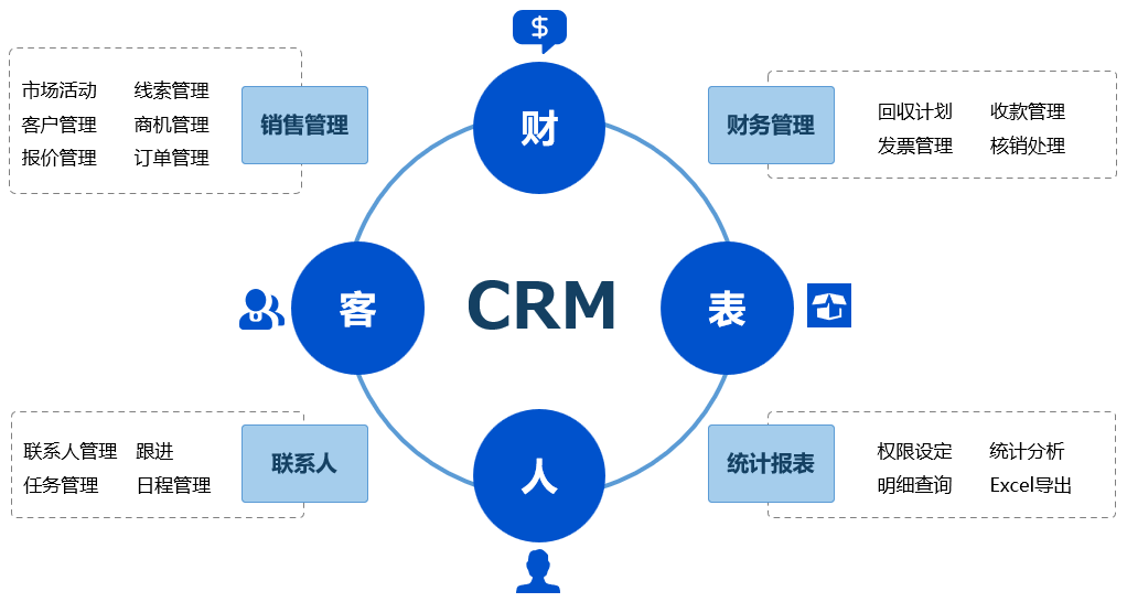 利用数字化解决方案,建立全面的CRM管理平台,以人、客、财、表四个场景为中心,支持企业搭建面向客户的工作平台、管理平台,实现基于数字技术的公司业务创新。