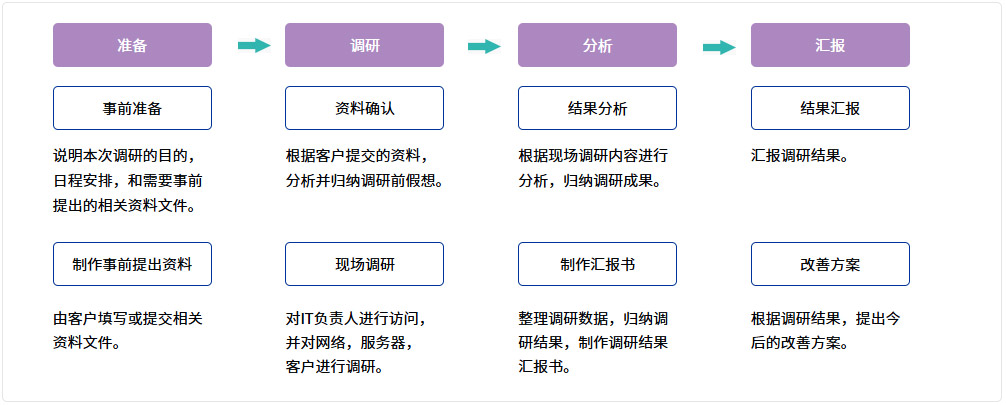 针对客户现有的IT基础设施进行调研,在掌握资产持有情况和实际利用的同时,分析存在的风险与问题。
