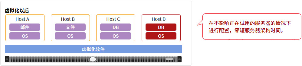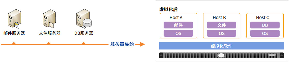 将几台物理服务器通过虚拟化的方式集成在一起,能够实现服务器环境的最适化,实现物理机台数的减少,消费电量的降低,占用空间的减小等。