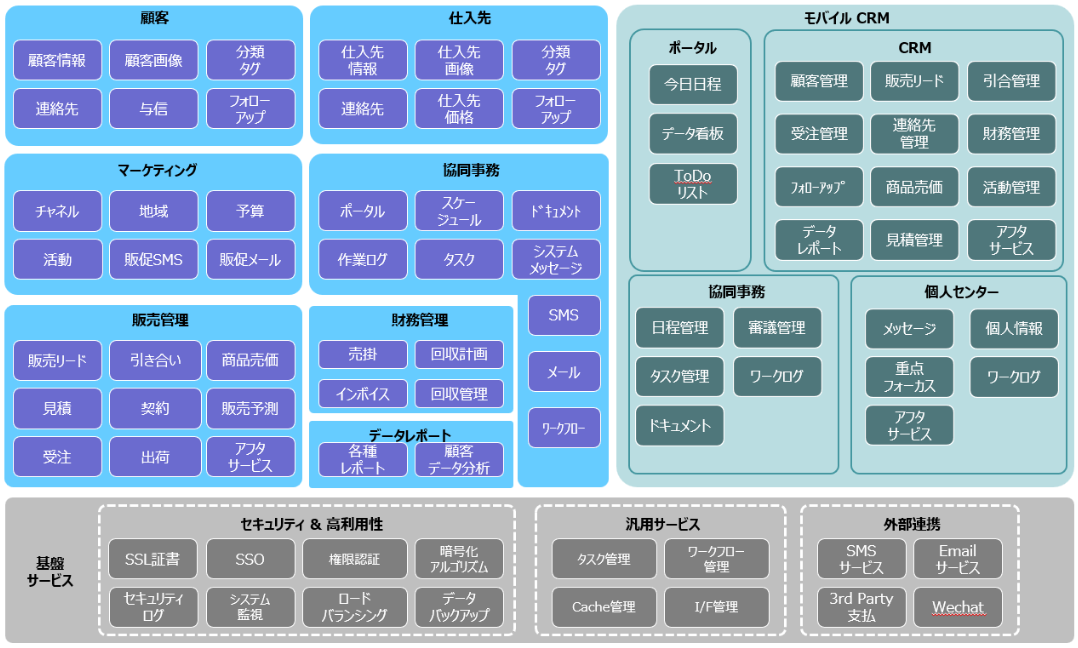 デジタル化ソリューションを利用し、全面的なCRMプラットファームを立てて、人、客、財、表4つのシーンを中心に、企業が顧客向けのワークプラット