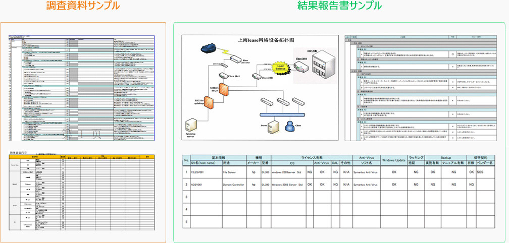 お客様の既存ITインフラ(ネットワーク、サーバー、クライアントなど)の調査を実施し、資産保有状況や利用実態などを把握すると共に、リスクを分析します。