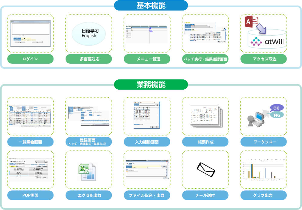 プログラムレスで機能を追加・拡張するatWill Platformを標準装備しています。 - 業務テンプレートと高速開発ツールを活用することで、お客様固有の業務にもFitする業務システムを実現します。